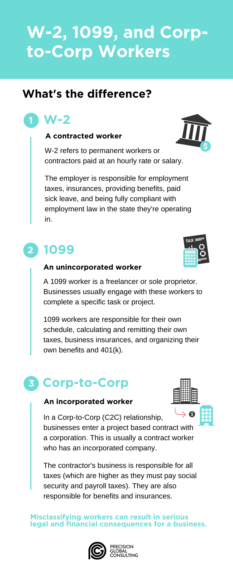 To help aid understanding, we have put together a simple infographic that breaks down the different ways to engage contingent workers in the US (including the most common W-2 employee classification)